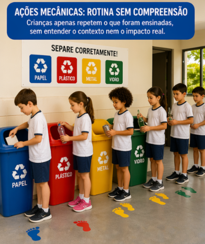 Na escola, as crianças aprendem desde cedo que papel vai no coletor azul, plástico no vermelho emetal no amarelo. A atividade está correta — mas será que isso é suficiente para formar cidadãos conscientes? Ou estamos ensinando apenas a repetir um gesto, sem que elas compreendam, de fato, o seu significado? Ao simplificar a educação ambiental a práticas isoladas — como o uso de cores para separação — arriscamos formar repetidores de comportamento, e não pessoas que compreendem a importância do que fazem.