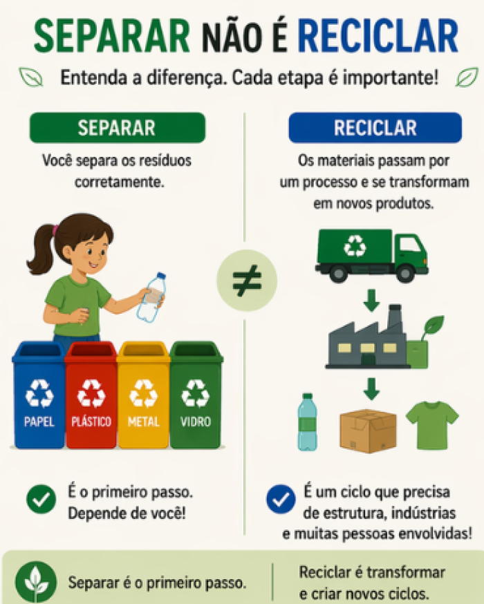 Separar não é reciclar. A separação é apenas o primeiro passo deum processo muito mais amplo, que envolve coleta adequada, triagem, transformação, estrutura, mercado e responsabilidade compartilhada entre poder público, empresas e sociedade. Quando esse contexto não é apresentado, o aprendizado fica incompleto.